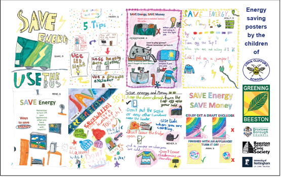 Greg Marshall, Deputy Leader Broxtowe Borough Council says, “the Council is thrilled to support the brilliant Greening Beeston, John Clifford School and the University of Nottingham. The artwork by the pupils is wonderful and is a great way to highlight the serious links between energy use and climate change. We fully support the save energy – save money campaign”.