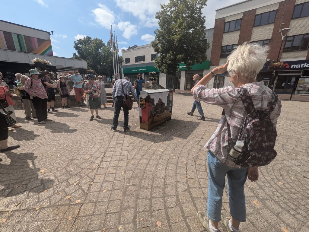 Civic Society executive members were on hand to liaise with a group who had not seen the social media notices of cancellation (our expert Anna Wheelhouse having fallen victim of a local lurgy). With upwards of twenty folks in attendance hot-weather necessitated precautionary measures about hydration and congregating in shade. So, the decision was made to go-ahead with the planned tour.