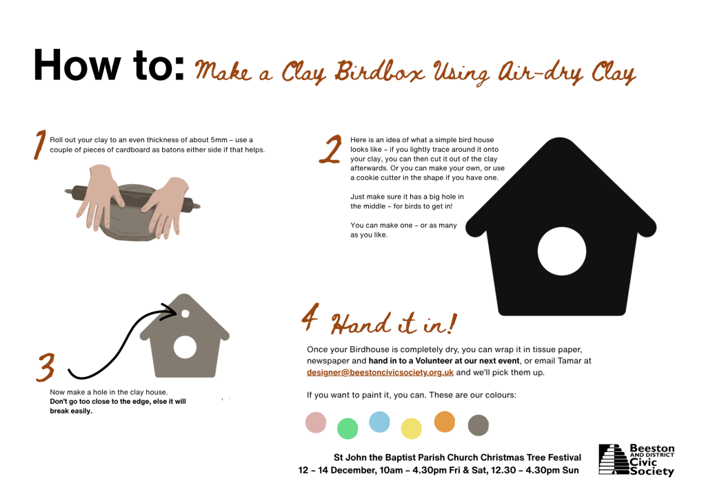 Once your decorations are completely dry, you can wrap them in tissue paper, newspaper and hand them in to a Volunteer at our December event, or email Tamar at designer@beestoncivicsociety.org.uk and we’ll pick them up!